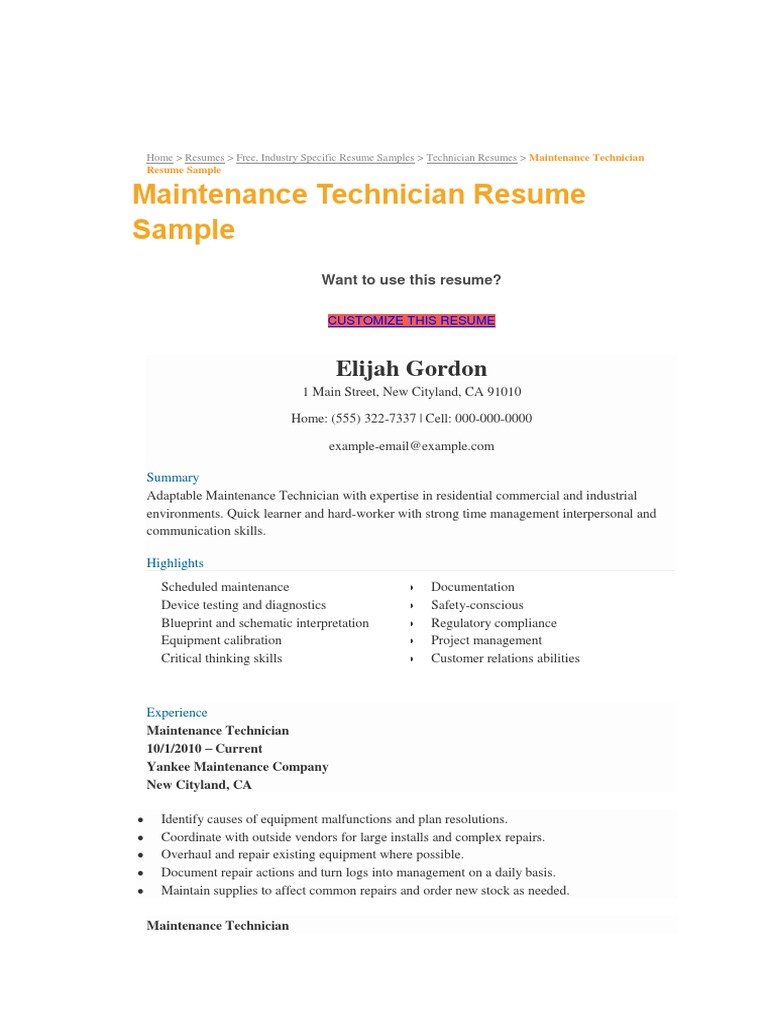 Find, Read, And Discover Maintenance Technician Resume Example, Such Us: