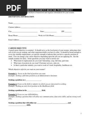 High School Student Resume Worksheet Pdf Resume Secondary School Sample Cover Letter For Resume Sample